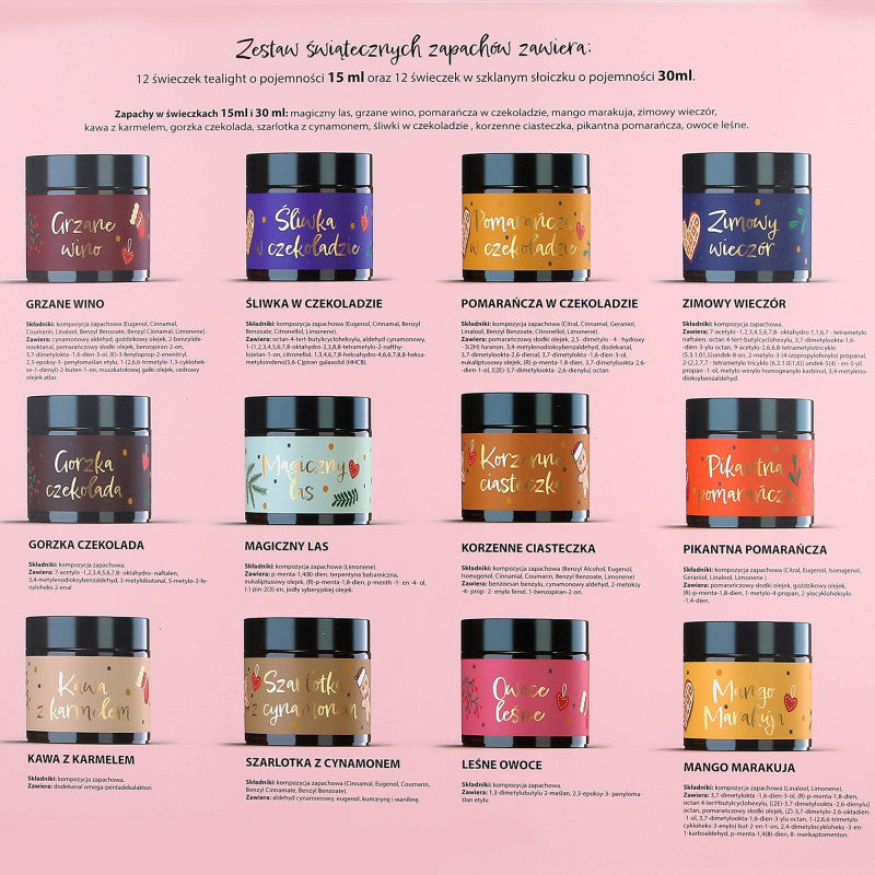HISKIN MERRY CHRISTMAS Advent Calendar with Christmas Candles is the perfect way to introduce the magical atmosphere of the holidays every day of December. This unique calendar contains 24 Christmas candles, each of which has a unique scent inspired by winter aromas such as cinnamon, vanilla or orange. Every day you can enjoy a new candle that will brighten up your home and fill it with a cozy, Christmas scent.