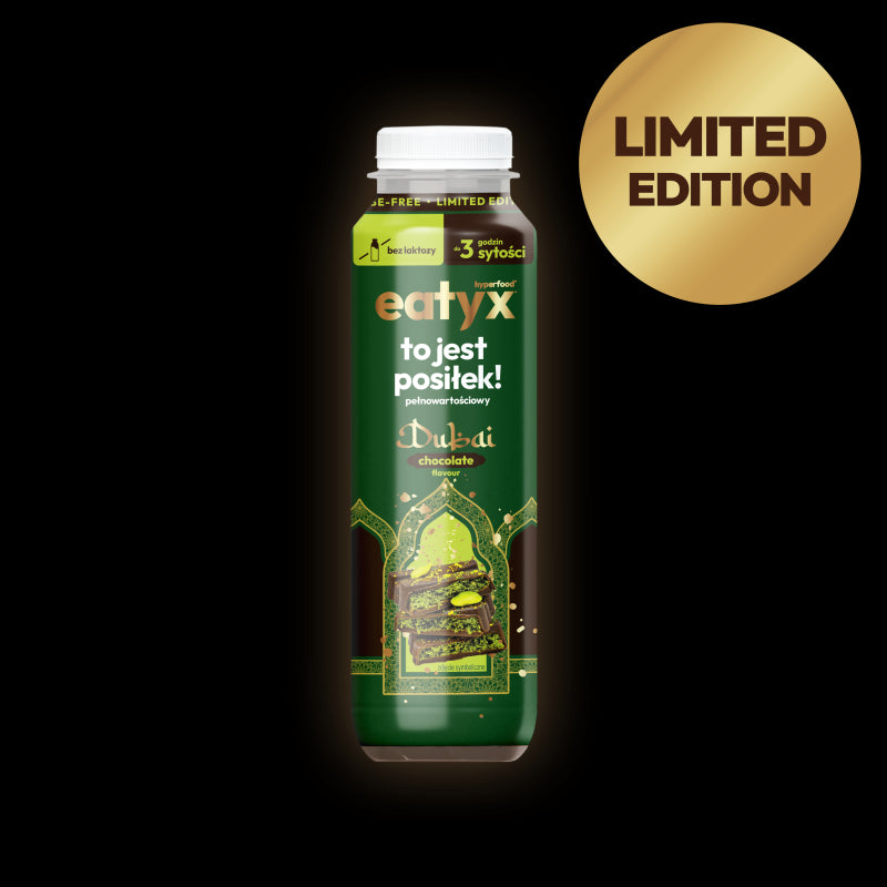Pełnowartościowy odżywczy posiłek w płynie, o smaku dubajskiej czekolady, w praktycznej butelce 300 ml. Bezglutenowa i bezlaktozowa formuła dostarcza witamin i minerałów, a także 21 g białka, błonnika, zdrowych tłuszczów i węglowodanów. Zapewnia uczucie sytości nawet do 3 godzin. Napój eatyx skutecznie zastępuje klasyczny posiłek i wspiera utrzymanie wymarzonej sylwetki oraz kontrolę wagi. Idealny do zabrania na siłownię, do pracy czy podczas wyjścia na miasto.