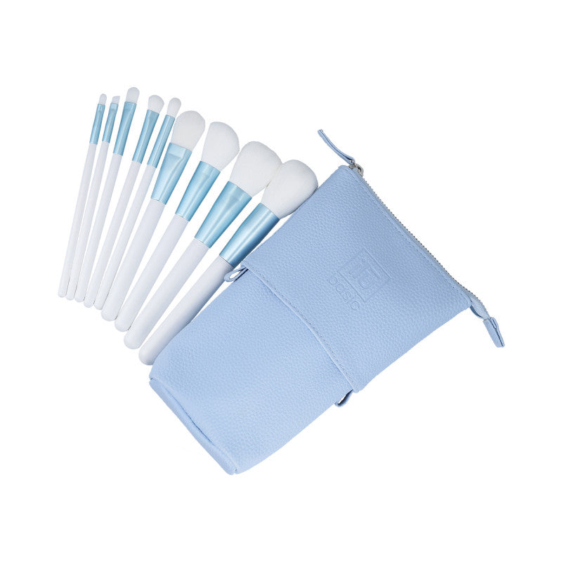 Zestaw składa się z 9 pędzli, które są niezbędne do wykonania makijażu dziennego lub wieczorowego. Pędzle są wyposażone w miękkie, syntetyczne włosie taklon, niebieskie skuwki i białe drewniane rączki. Do zestawu dołączone jest rozkładane etui idealne do przechowywania pędzli w domu, jak i zabrania ich w podróż. Etui jest wykonane z wegańskiego materiału i wyposażone w wysokiej jakości miedziany zamek błyskawiczny.