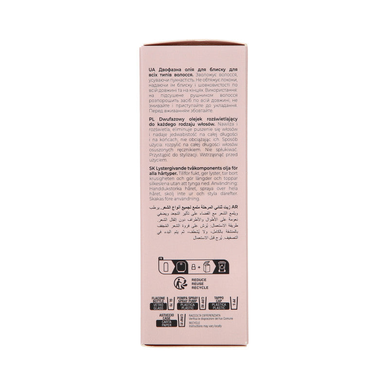 Rezultat: Włosy stają się jedwabiście gładkie, pełne blasku i elastyczności, bez efektu obciążenia. Regularne stosowanie olejku poprawia kondycję włosów, ułatwia ich stylizację oraz chroni przed szkodliwym działaniem czynników zewnętrznych.
