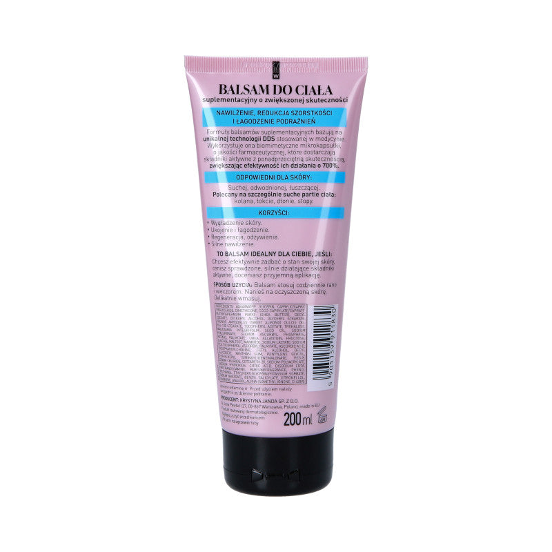 Specjalistyczny balsam nawilżający przeznaczony do pielęgnacji szorstkiej, suchej skóry z tendencją do podrażnień. Kwas hialuronowy, mocznik, trechaloza, witamina A, C, E oraz olej makadamia tworzą niezwykłą mieszankę, która przynosi ukojenie suchej skórze oraz łagodzi podrażnienia. Balsamy suplementacyjne bazują na technologii DDS, która wykorzystuje biomimetyczne mikrokapsułki, które to dostarczają aktywne składniki z ponadprzeciętną skutecznością. Kosmetyk polecany jest szczególnie na suche partie tj. kolana, łokcie, dłonie i stopy.