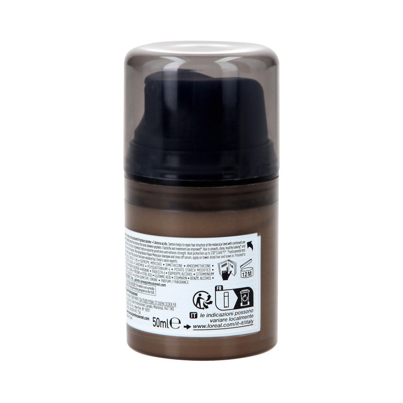 Sposób użycia: Aby uzyskać optymalne rezultaty, stosuj po użyciu szamponu Absolut Repair Molecular i spłukiwanego serum. Nanieść na osuszone ręcznikiem włosy. Podziel włosy na dwie sekcje i nałóż jedną pompkę produktu na każdą z nich. Rozczesz włosy, aby uzyskać optymalne rozprowadzenie. Pozostaw bez płukania. Kontynuuj suszenie suszarką lub pozostaw do naturalnego wyschnięcia.