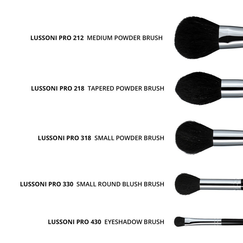 - LUSSONI PRO 318 Small Powder Brush – niewielki pędzel do pudru i innych sypkich kosmetyków z miękkim, naturalnym włosiem kozy. Wymiary: włosie - 40 mm, pędzel - 205 mm.