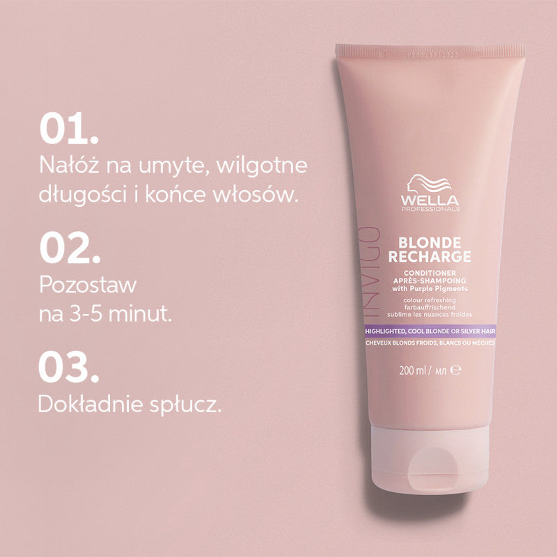 Odżywka Wella Invigo służy do pielęgnacji włosów w chłodnych odcieniach blond, naturalnych lub farbowanych. Formuła Wella Invigo Blonde Recharge chroni przed ujawnianiem się żółtych tonów.