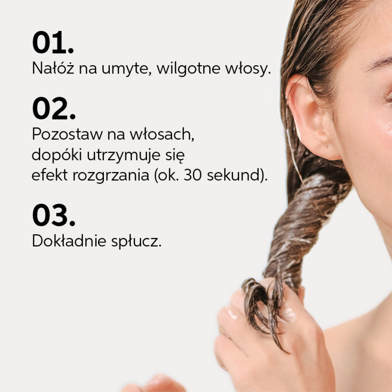 Sposób użycia: Maskę rozprowadzić równomiernie na umytych, osuszonych ręcznikiem włosach. Pozostawić na 1 minutę, aby maska się rozgrzała. Dokładnie spłukać. Dla mocniejszego efektu rozgrzewającego maskę należy nakładać suchymi dłońmi.