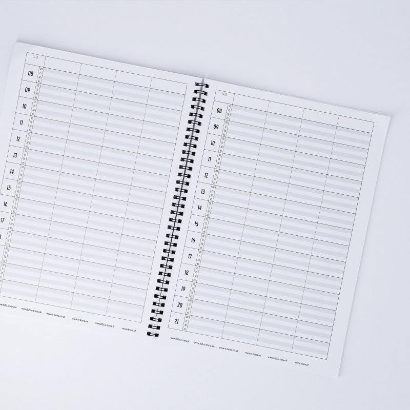 Format A4, horaire de 8h00 à 21h45, divisée en lignes de 15 minutes