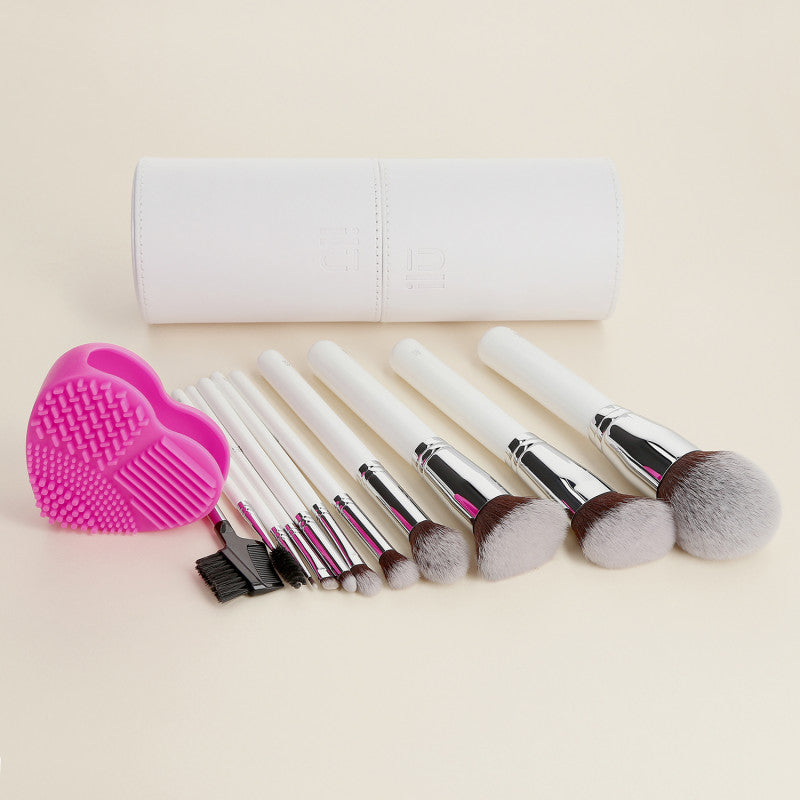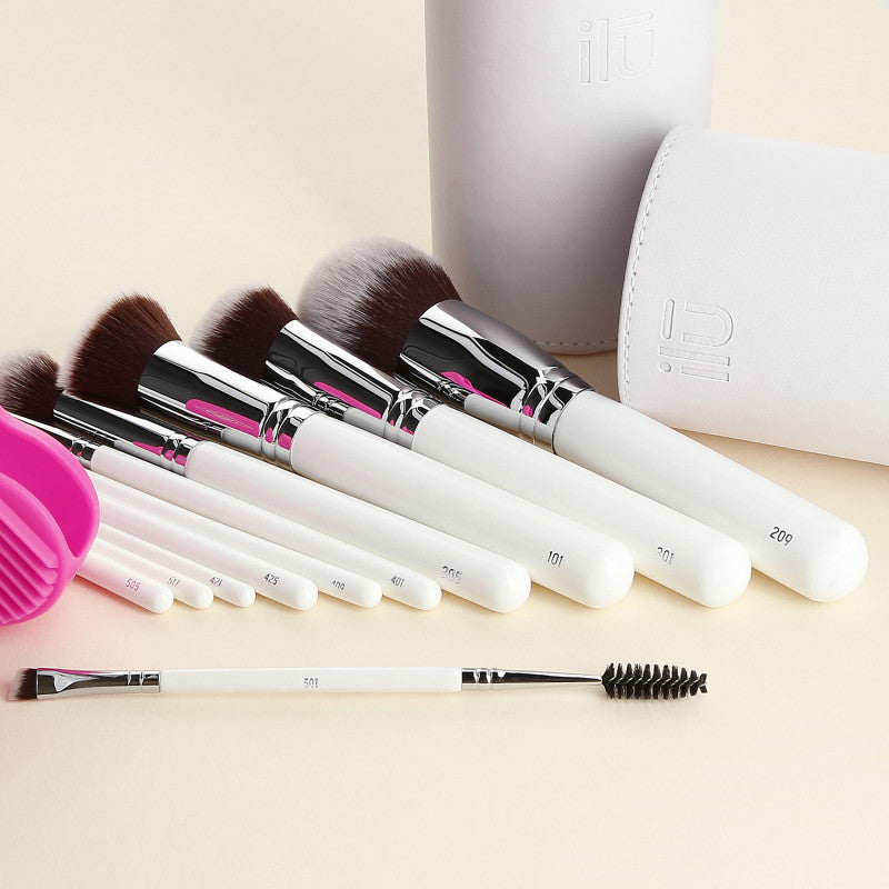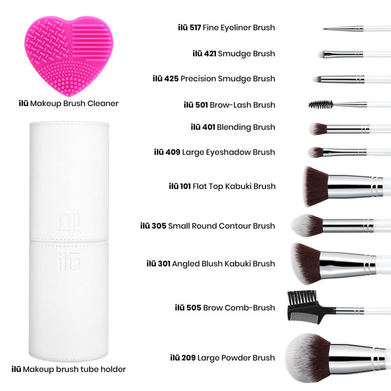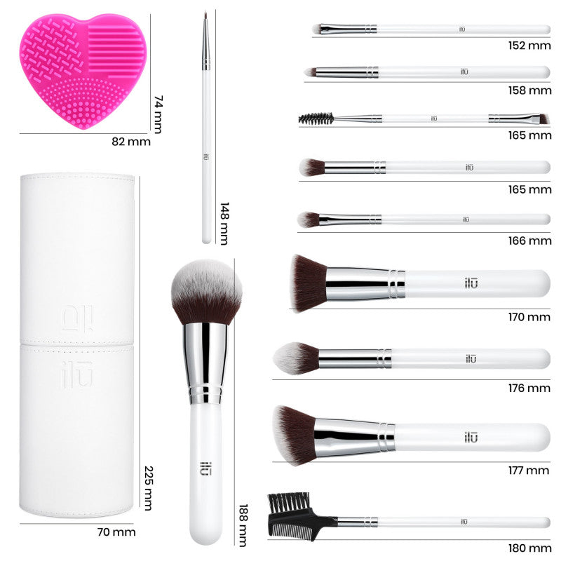 Le set Ilū Expert Touch est composé d'accessoires professionnels pour réaliser un maquillage parfait de jour ou de soirée. Le set se compose de 11 pinceaux pour le visage, le contouring et le maquillage des yeux. Le nettoyeur inclus dans l'ensemble aidera à garder les brosses en parfait état. Un élégant tube de brosse complète l'ensemble.