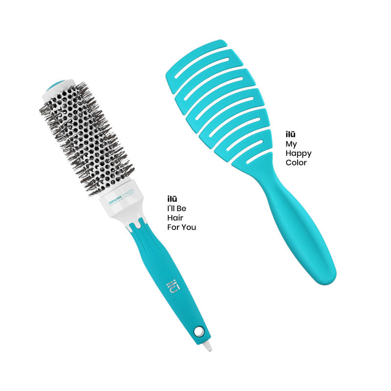 Les brosses Ilū sont une combinaison parfaite des meilleurs matériaux, d'un design et d'une technologie extraordinaires. Elles sont conçues pour peigner les cheveux secs et humides et masser le cuir chevelu, améliorant la circulation sanguine. Dans le set ILŪ vous trouverez une brosse à cheveux végan et une brosse à cheveux de 33 cm de diamètre conçue pour les cheveux courts.