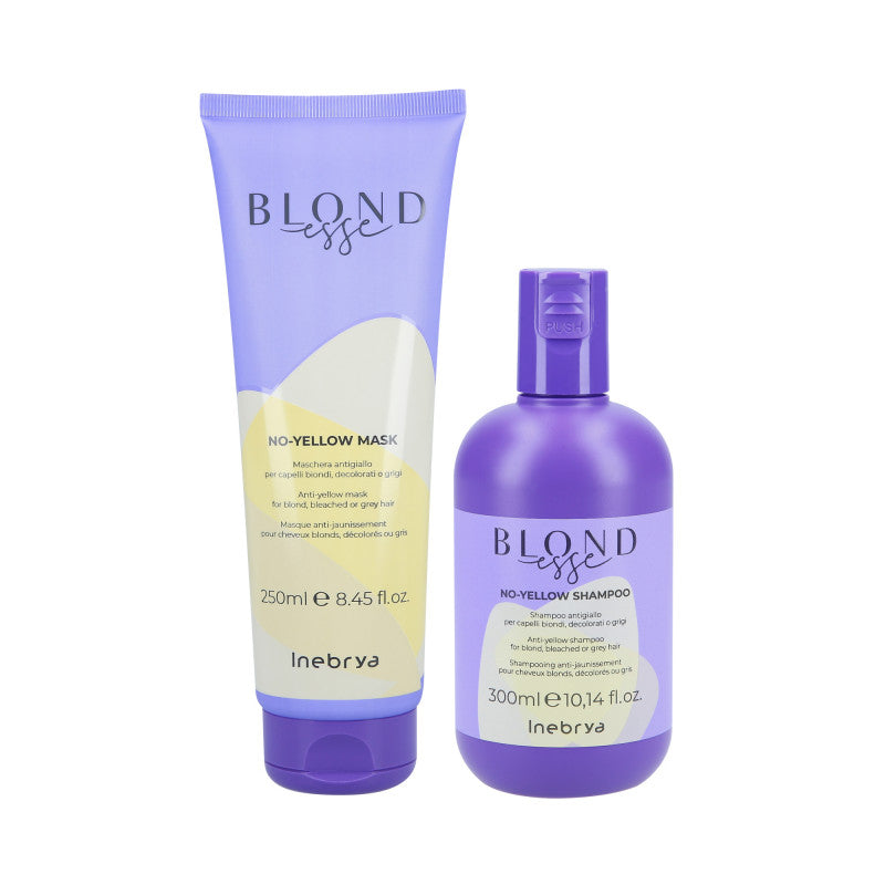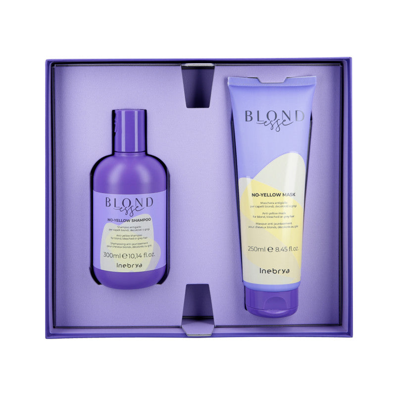 L' ensemble Inebrya No Yellow contient un shampooing et un masque pour les cheveux blonds, éclaircis et gris qui ont besoin d'atténuer et de neutraliser les tons jaunes.