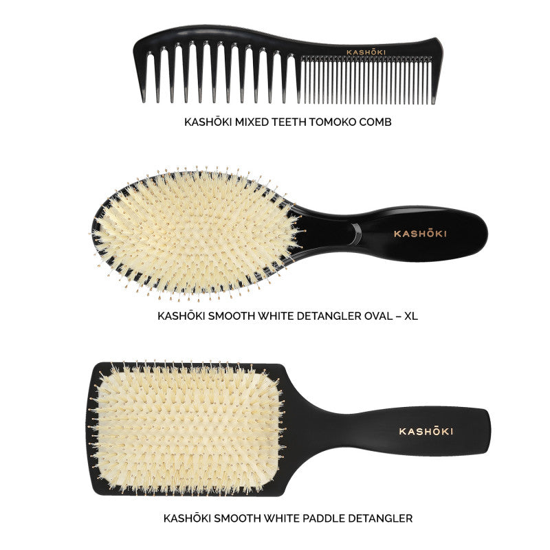 Le set comprend un peigne Kashōki Tomoko, qui facilite le coiffage des cheveux même épais et bouclés, secs ou humides et il peut être utilisé pour distribuer très facilement des produits de soins capillaires.
