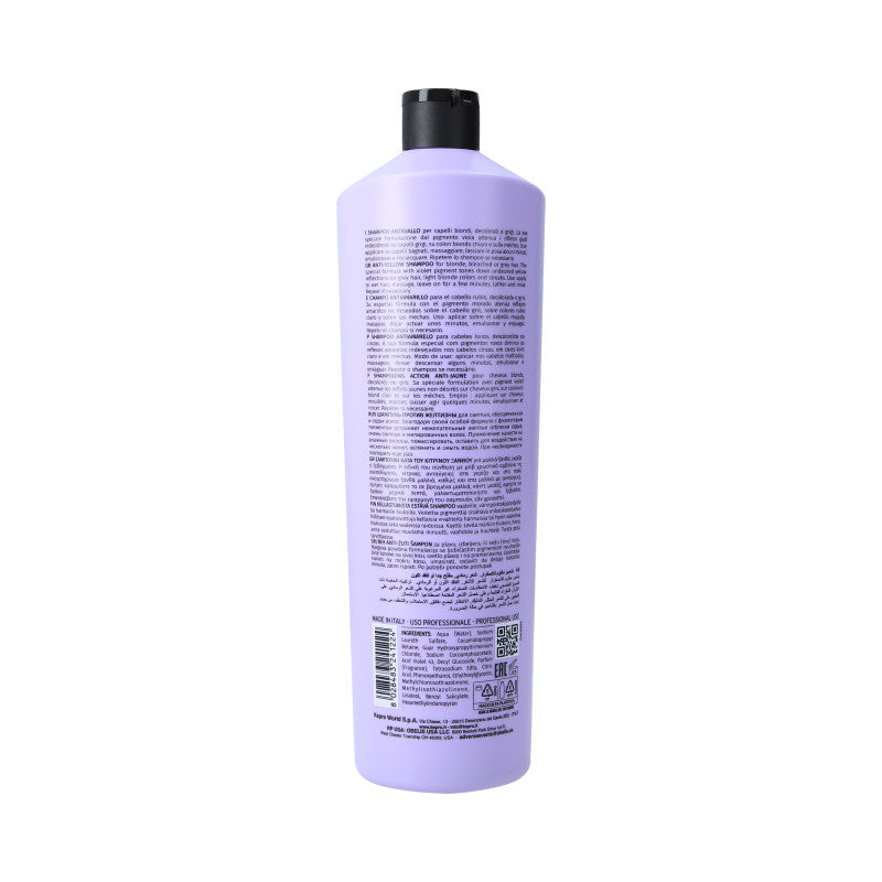 KAYPRO ANTI YELLOW GIGS est un shampooing violet professionnel pour cheveux blonds, gris et décolorés. Il neutralise efficacement les reflets jaunes grâce à ses pigments violets et bleus. Il apporte une teinte fraîche et lumineuse tout en nettoyant, nourrissant et revitalisant les cheveux en douceur. Sa formule a été créée en Italie avec un engagement de qualité et des résultats dignes d'un salon de coiffure.