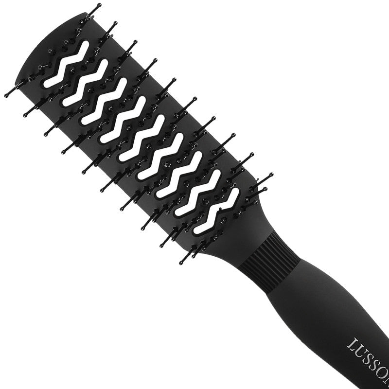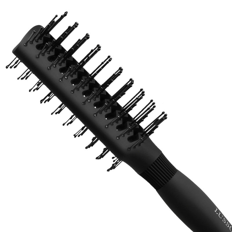 Brosse double face pour le styling des cheveux courts, d’hommes et de femmes. DuoVent chez Lussoni a été conçue pour ajouter du volume de façon simple et rapide: elle comprend des poils de deux longueurs différentes avec des propriétés antistatiques et une poignée ergonomique.