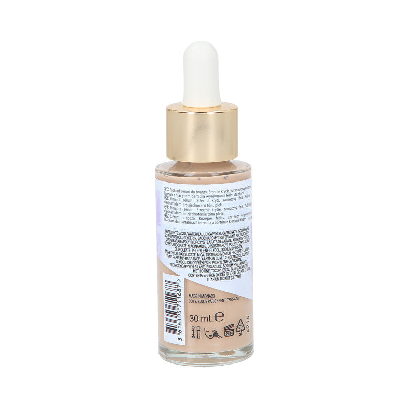 Ce fond de teint offre une couvrance moyenne et naturelle avec un fini mat satiné qui illumine subtilement le teint et lui confère un aspect sain et reposé. Grâce à sa texture légère, il se fond parfaitement à la peau, sans l'alourdir ni créer d'effet masque. Testé dermatologiquement et cliniquement, il convient également aux peaux sensibles.