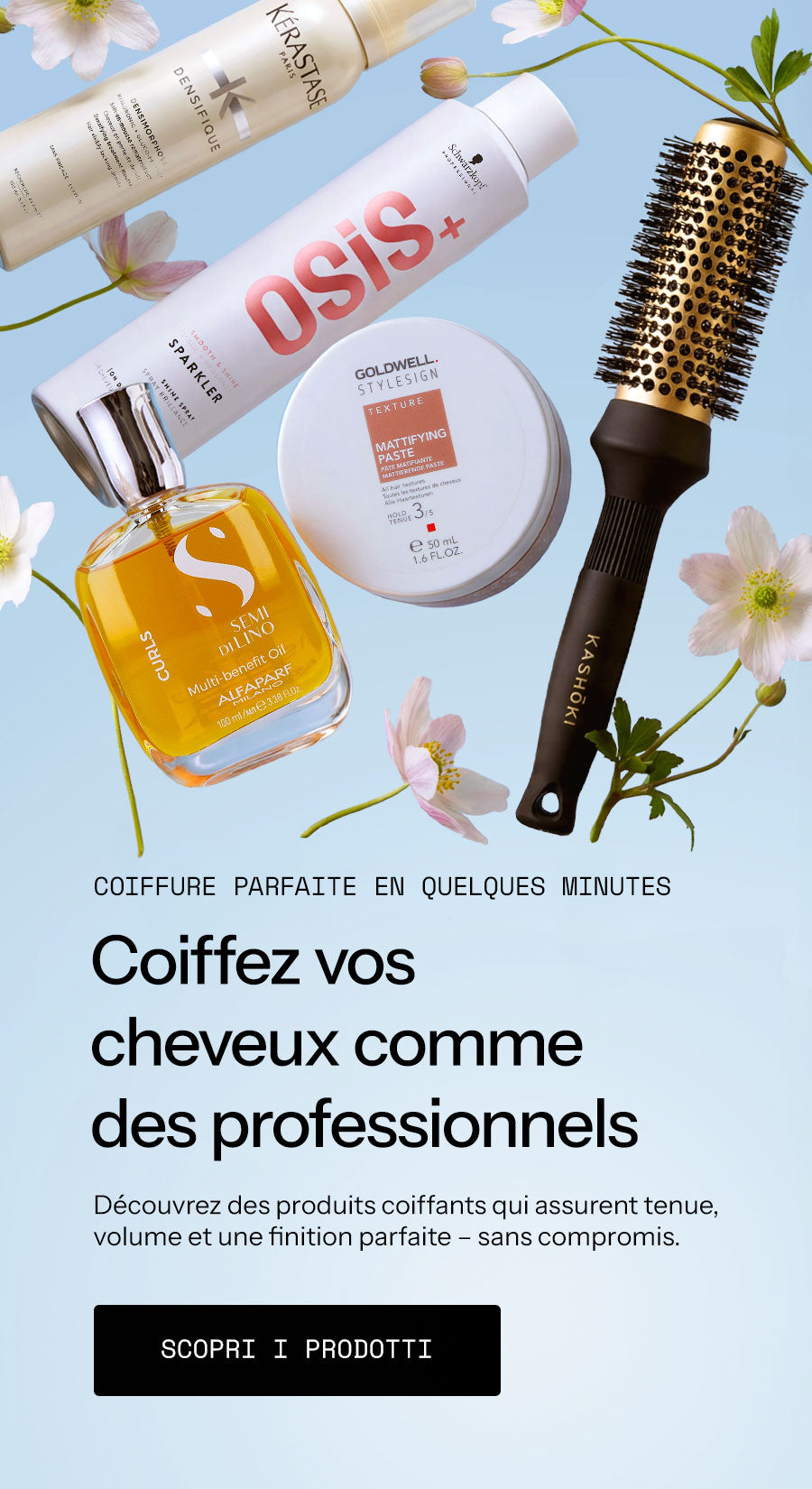 Bienvenue dans le monde des beaux cheveux ! C'est là que les mèches, mèches, mèches, vagues et boucles acquièrent une toute nouvelle qualité et brillance. Grâce à des produits professionnels de soins, de coiffage et de coloration, nous pouvons allier la passion de la beauté, de l'esthétique et de la perfection avec le plus grand souci de la santé ! Notre offre comprend des cosmétiques capillaires haut de gamme et innovants, répondant à des normes de qualité élevées et destinés aussi bien aux coiffeurs professionnels qu'aux clients particuliers. Vous y trouverez un large choix d'excellents produits tels que : shampoings, après-shampooings, masques, huiles, vernis, mousses, pâtes, sprays, produits de permanente, produits chimiques de lissage, préparations pour teintures et colorations temporaires, accessoires de coiffure nécessaires à la coiffure, appareils de coiffure.